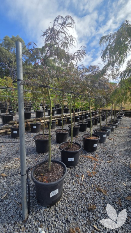 This is a vigorous and sturdy, upright growing Japanese maple with a cascading form. It retains its larger, intricate crimson-burgundy foliage well throughout the season. They do not bronze out in late season, as do other red dissectum maples.