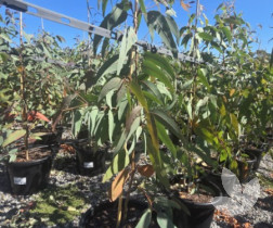 This Australian native Corymbia (syn. Eucalyptus) has scaly yellow-brown bark. The leaves are broad, thick, curved and blue-green in colour. It produces large creamy flowers in spring that are in clusters of up to seven. The flowers attract birds and insects in spring.