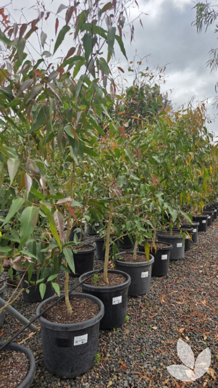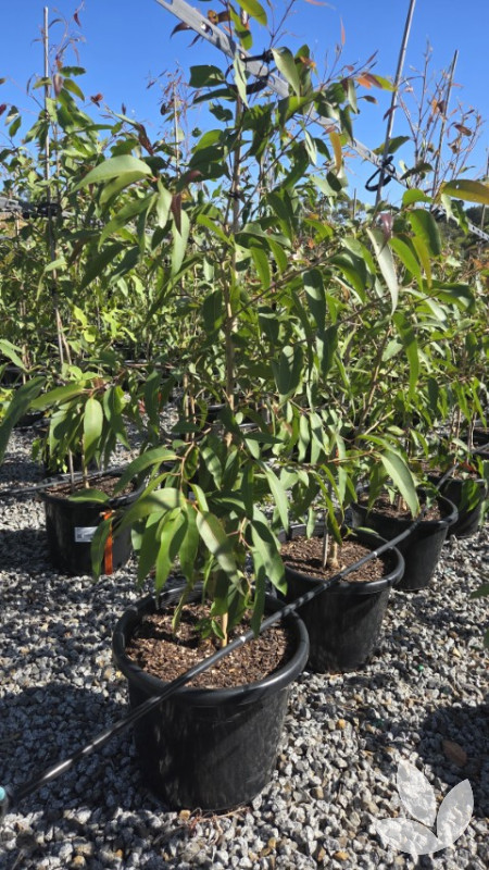 This is a stately native Corymbia (syn. Eucalyptus) which grows straight and tall. The bark sheds in summer and is smooth and cream in colour with grey spots from the older bark, providing contrast and interest with its mottled appearance. The leaves are dark green and glossy and from autumn to winter, small clusters of fragrant white flowers appear attracting birds and honeybees to the area. Note: Not to be confused with the "Red Spotted Gum" which is listed separately.