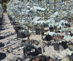 This is a small-growing eucalypt usually seen as a tall, spreading shrub that retains its juvenile foliage into maturity. Young leaves, stems and inflorescences have a powdery white bloom. Foliage is strikingly silvery-grey and round in form. Cream flowers are produced between May and November and the large capsules that follow are cup-shaped.
