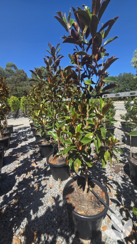 A beautiful dense tree with small mid-green glossy leaves and brown velvety underside. It produces creamy white fragrant flowers anytime during the warmer months from November through March. The tree grows denser and flowers are bigger than 'Little Gem', making this a popular alternative. It differentiates itself from other varieties by its wavy edge to its leaf and its bright pink new growth.